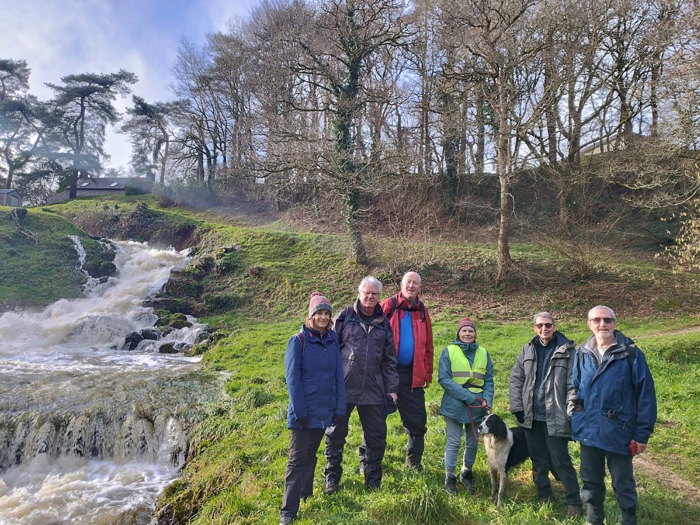 Bien qu'un peu à la dernière minute, la visite d'aujourd'hui a tout de même rassemblé 6 participants pour marcher autour de l'Etang de Glomel. Le temps était sec, lumineux et ensoleillé bien qu'un peu boueux. Nous avons fait une pause à mi-chemin pour une photo et vers la fin de la balade, nous avons été récompensés par une belle prise de vue sur les chutes d'eau du barrage.